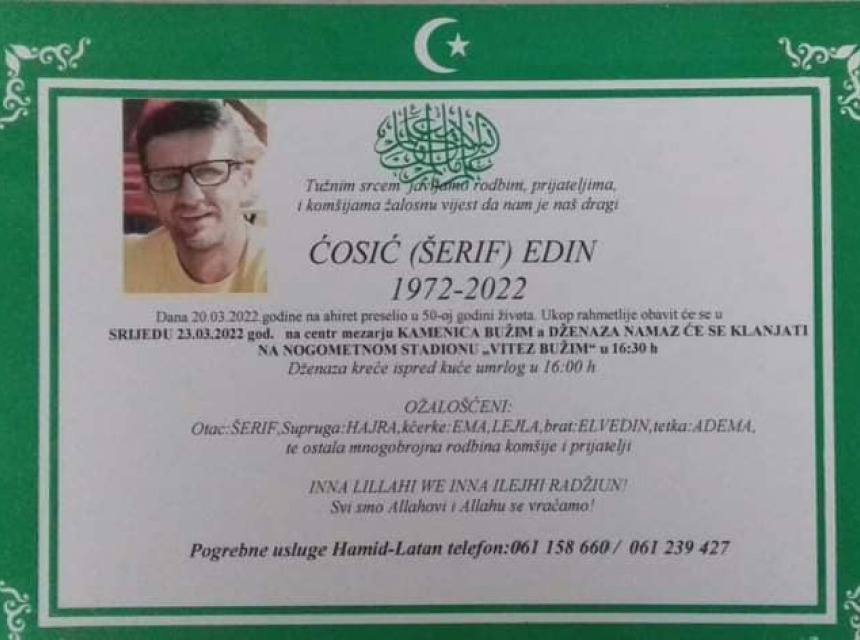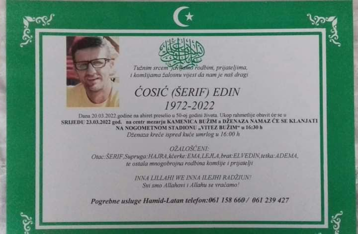 Tužnog srca i s bolom u duši obavještavamo rodbinu, komšije i prijatelje da je naš dragi Ćosić (Šerif) Edin, dana 20.03.2022. godine, u 50-oj godini života, preselio na Ahiret.