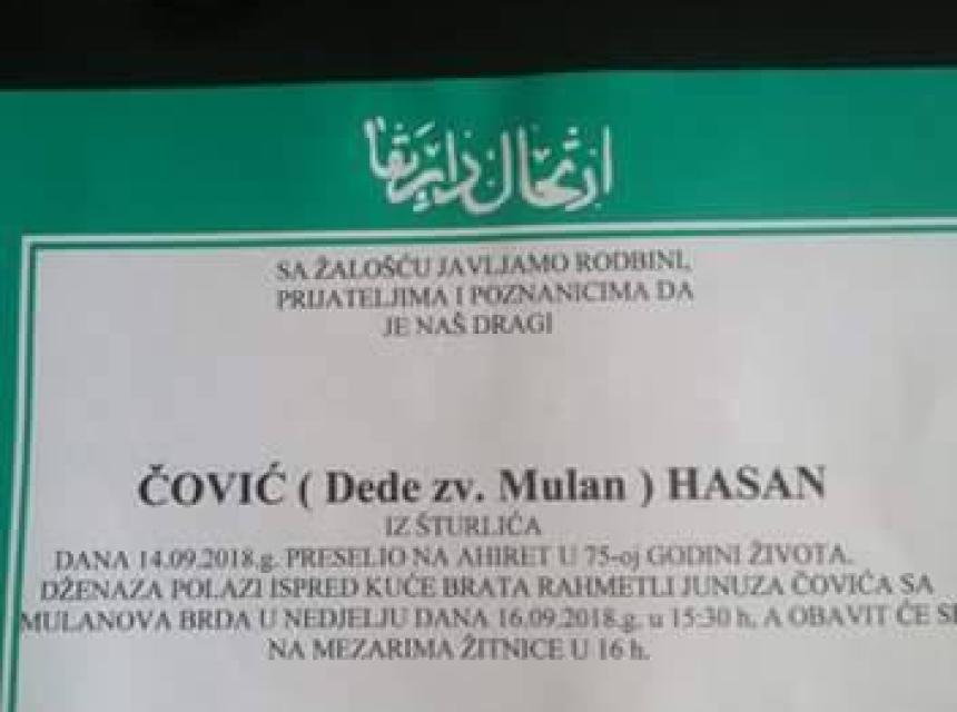 Sa žalošću javljamo rodbini, prijateljima i komšijama da je dana 24.09.2018.g. u 75-oj. godini života na Ahiret preselio Čović (Dede zv. Mulan) Hasan.