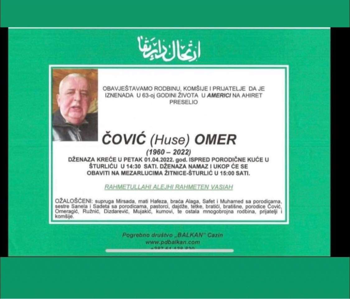 Tužnog srca i s bolom u duši obavještavamo rodbinu, komšije i prijatelje da je naš dragi Čović (Huse) Omer u 63. godini života preselio na Ahiret.