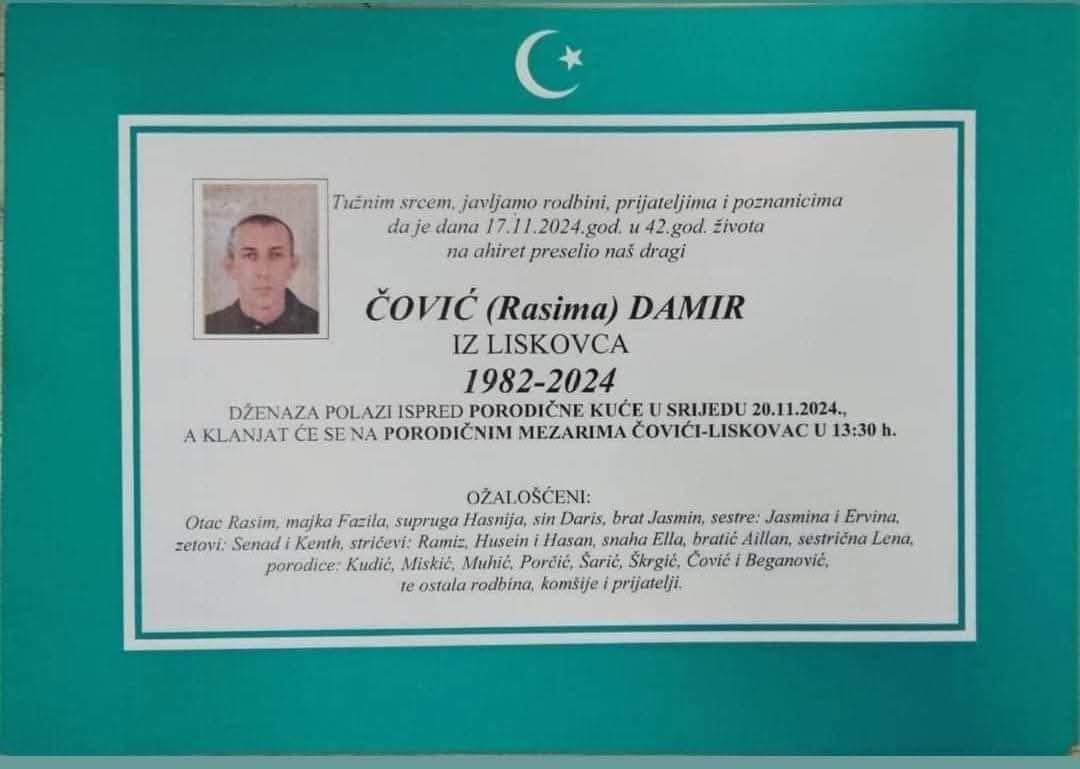Obavještavamo rodbinu i prijatelje da je 17.11.2024. godine na ahiret u 42-oj godini života preselio Čović (Rasima) Damir.