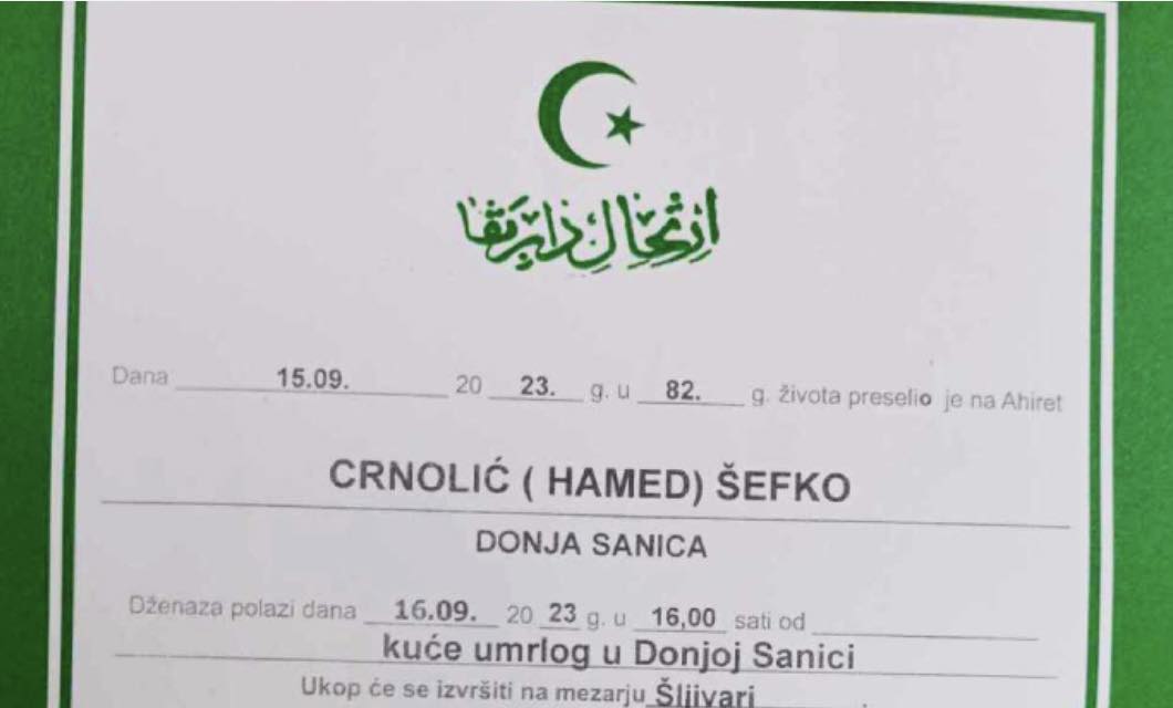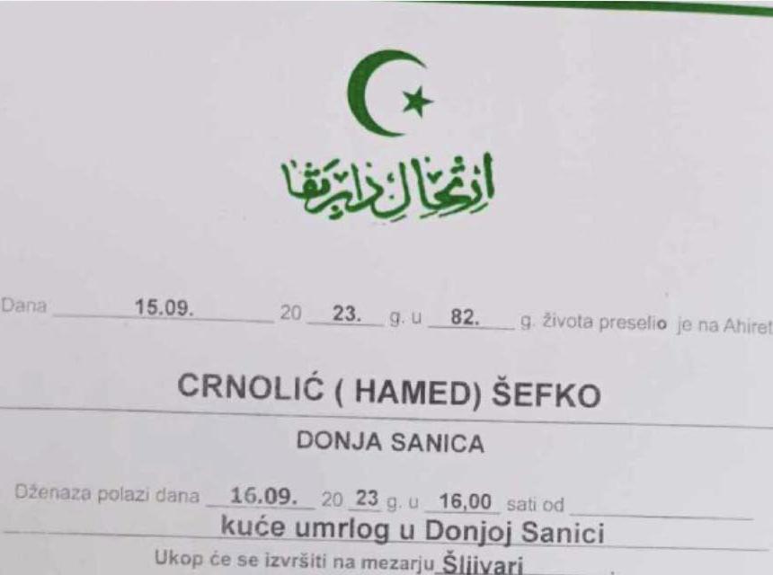Dženaza polazi dana 16.09. 20 23 g. u 16,00 sati od kuće umrlog u Donjoj Sanici.
