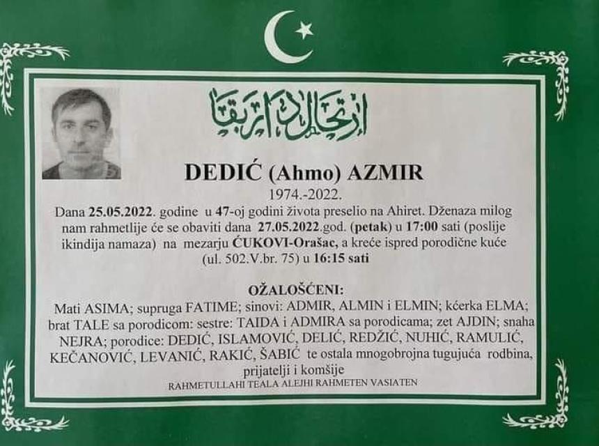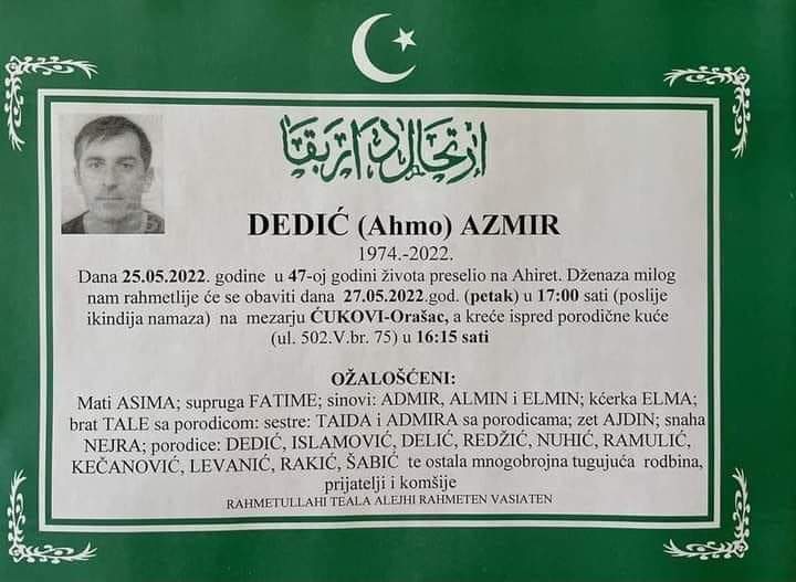 Tužnog srca i s bolom u duši obavještavamo rodbinu, komšije i prijatelje da je naš dragi Dedić (Ahmo) Azmir u 47. godini života preselio na Ahiret.