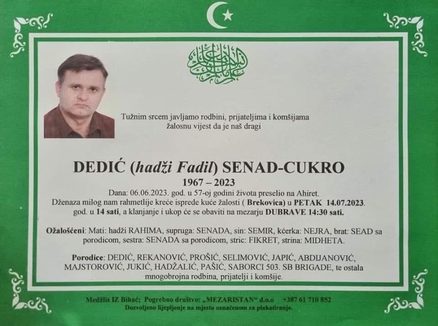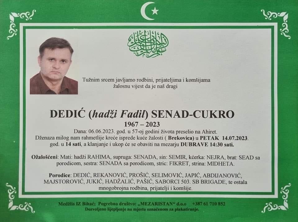 Tužnim srcem i bolom u duši javljamo rodbini, prijateljima i komšijama da je naš dragi Dedić (hadži Fadil) Senad - Cukro, dana 06.06.2023. godine u 57-oj godini života, preselio na Ahiret.