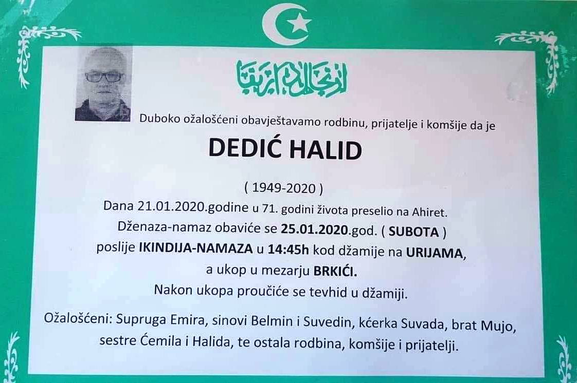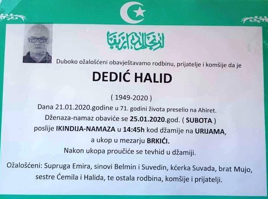 Tužnim srcem i bolom u duši javljamo rodbini i prijateljima da je naš dragi Dedić Halid u 71. godini života preselio na Ahiret dana 21.01.2020. godine.