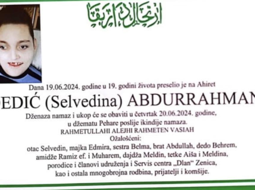Tužnim srcem i bolom u duši javljamo rodbini, prijateljima i komšijama da je naš dragi Dedić (Selvedina) Abdurrahman, dana 19.06.2024. godine u 19-oj godini života, preselio na Ahiret.