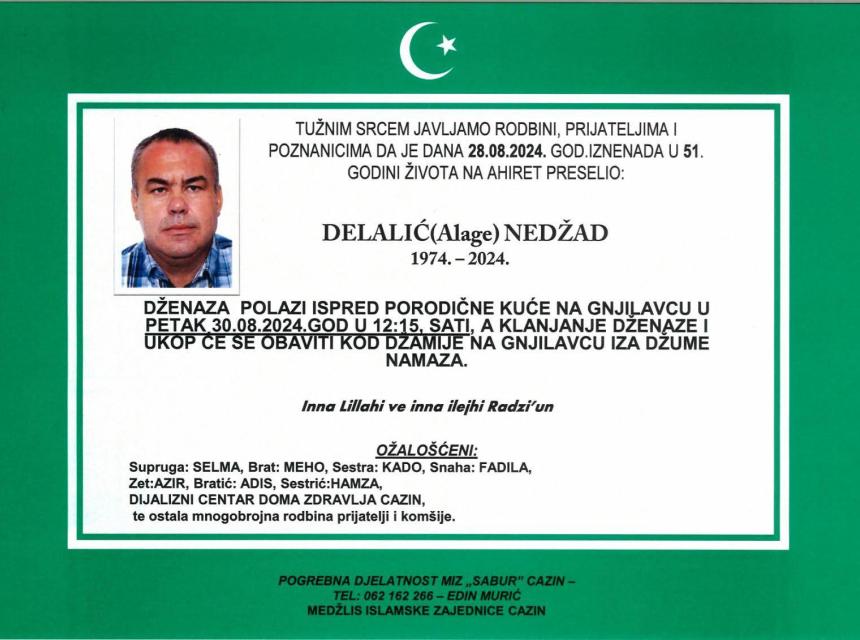 Tužnim srcem i bolom u duši javljamo rodbini, prijateljima i komšijama da je naš dragi Delalić (Alage) Nedžad, dana 28.08.2024. godine u 51-oj godini života, preselio na Ahiret.