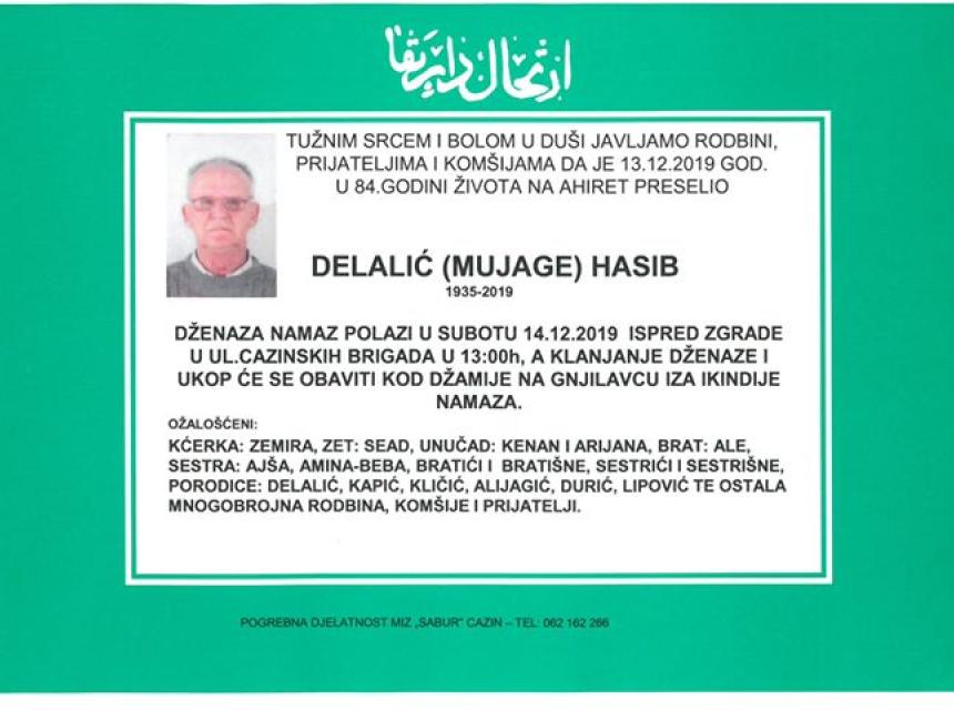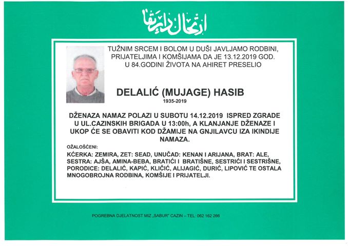 S tužnim srcem i bolom u duši javljamo rodbini i prijateljima da je naš dragi Delalić (Mujage) Hasib dana 13.12.2019. godine u 84. godini života preselio na Ahiret. Dženaza polazi 14.12.2019. ispred zgrade u ul. Cazinskih brigada u 13:00 h, a klanjanje dženaze i ukop će se obaviti kod džamije na Gnjilavcu nakon ikindije namaza.