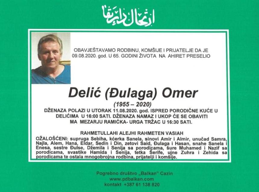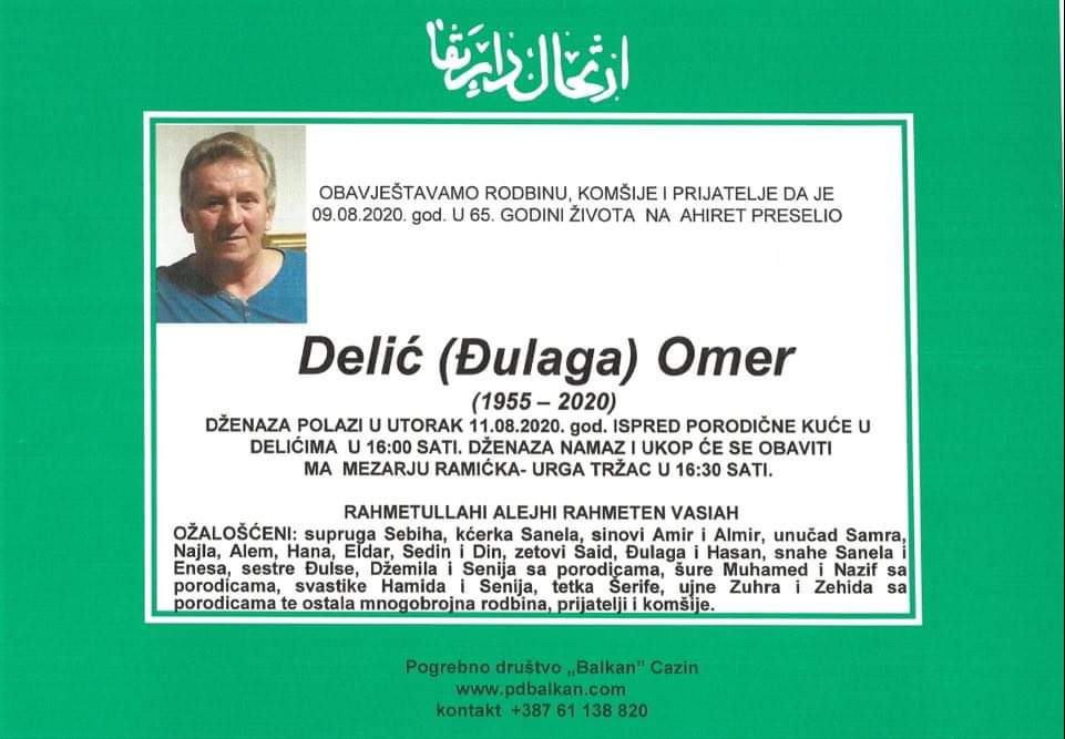 Tužnog srca i s bolom u duši obavještavamo rodbinu, komšije i prijatelje da je naš dragi Delić (Đulaga) Omer, dana 09.08.2020. godine, u 65-oj. godini života, preselio na Ahiret.