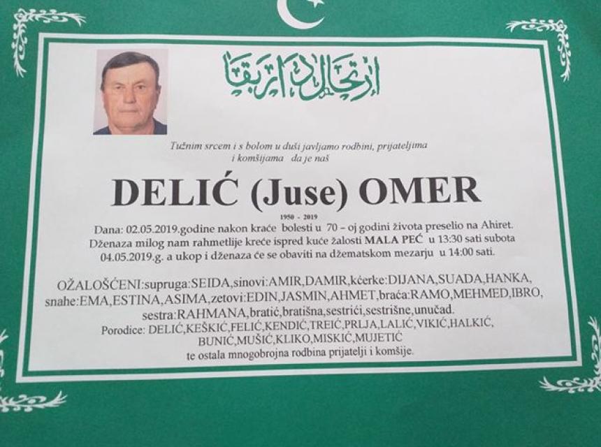 Tužnim srcem i bolom u duši javljamo rodbini, prijateljima, komšijama i poznanicima da je dana 02.05.2019. godine u 70.-oj godini života nakon kraće bolesti na Ahiret preselio naš dragi Delić (Juso) Omer.