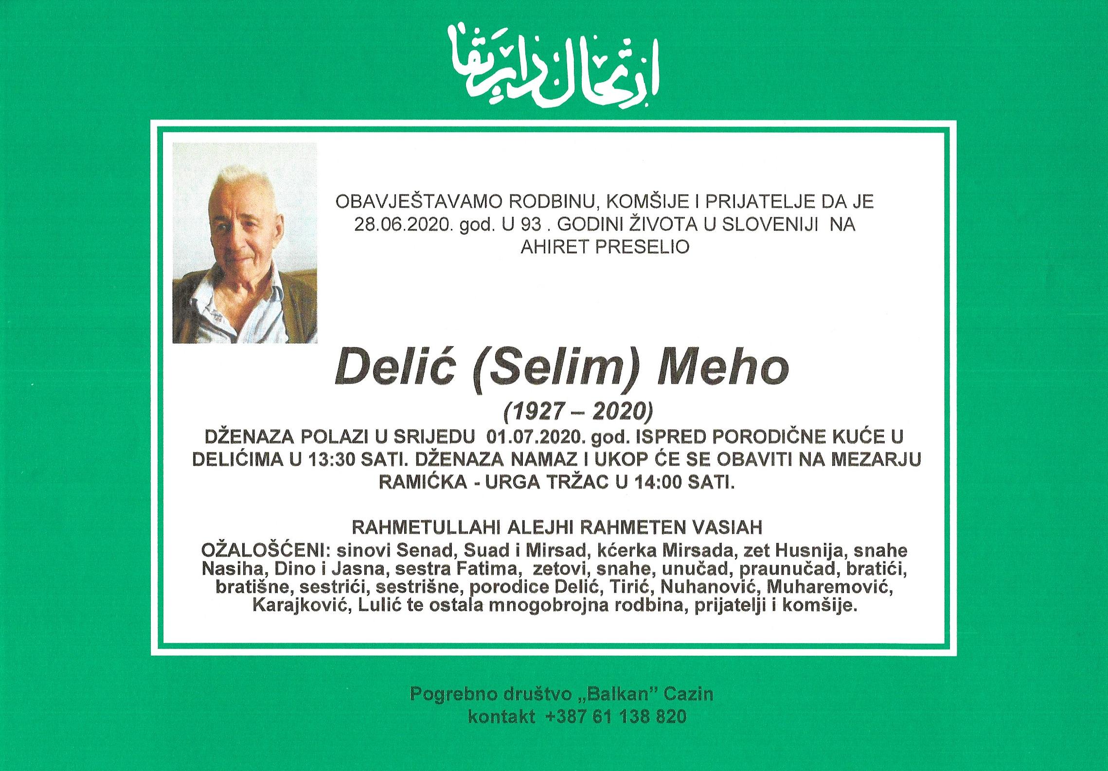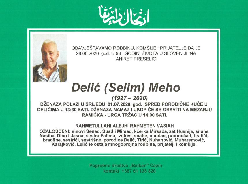 Tužnim srcem i bolom u duši javljamo rodbini, prijateljima i komšijama da je dana 28.06.2020. godine u 93-oj godini života preselio na Ahiret, Delić (Selim) Meho.