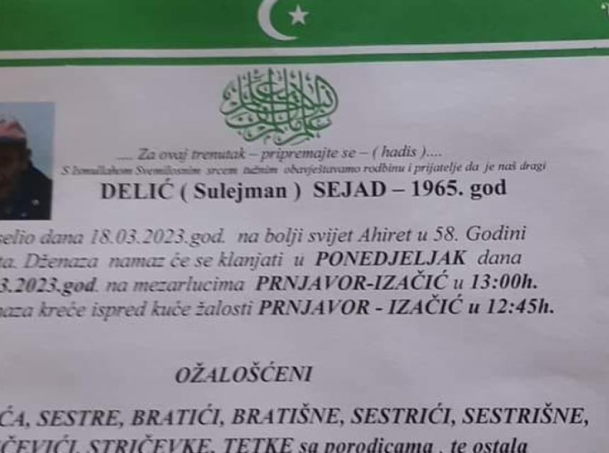 Tužnim srcem obavještavamo rodbinu, prijatelje i poznanike da je u ponedjeljak, 18.3.2023. godine u 58. godini života na Ahiret preselio naš dragi Delić (Sulejman) Sejad.