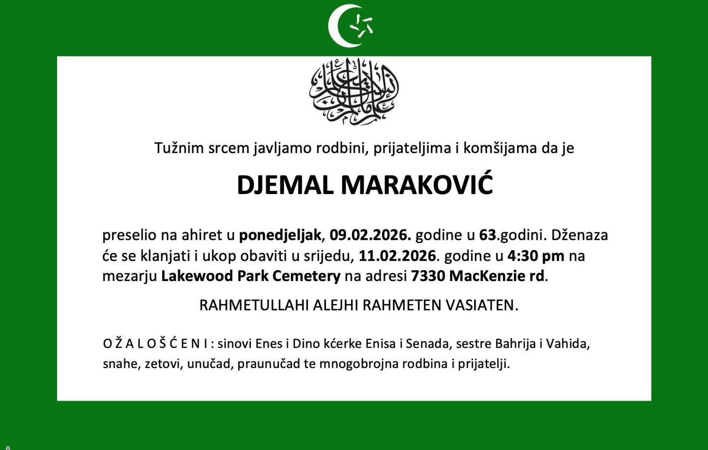 Dženaza će se klanjati i ukop obaviti u srijedu, 11.02.2026. godine, u 16:30 sati na mezarju Lakewood Park Cemetery, na adresi 7330 MacKenzie Rd.