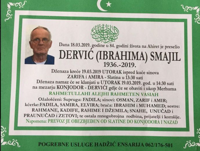 Obavještavamo rodbinu, komšije i prijatelje da je 18.03.2019. u 84-oj godini života na Ahiret preselio Dervić (Ibrahima) Smajil.