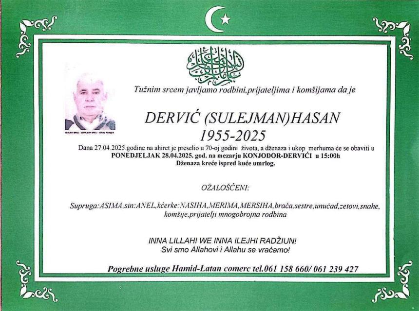 Dana 27.04.2025.godine na ahiret preselio u 70-oj godini života, a dženaza i ukop merhuma će se obaviti u PONEDELJAK 28.04.2025.god. na mezarju KONJODOR-DERVIĆI u 15:00h. Dženaza kreće ispred kuće umrlog.