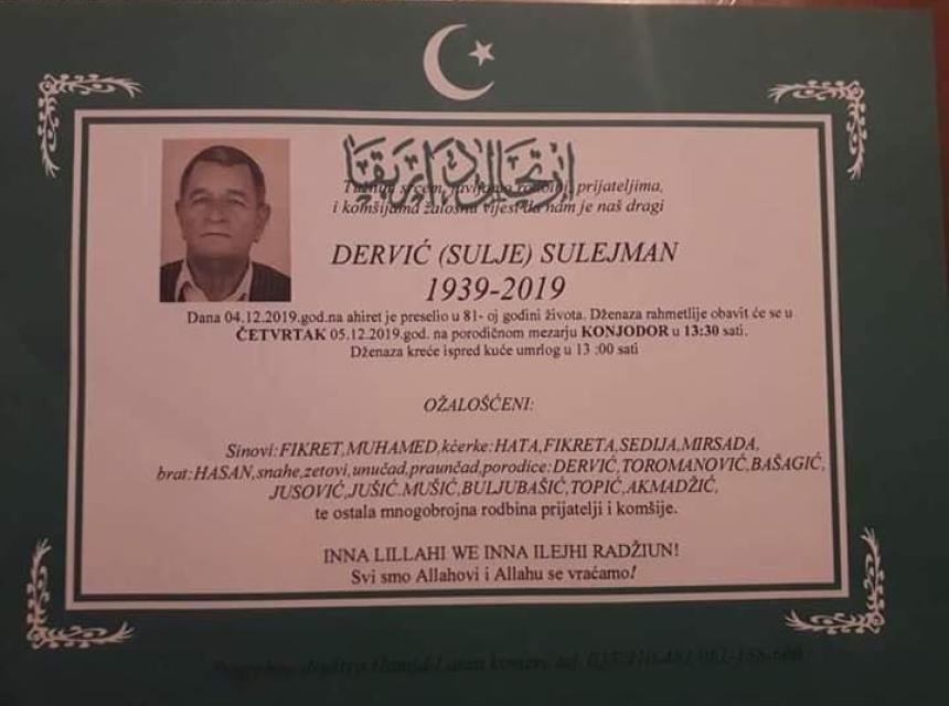 Tužnim srcem i s bolom u duši javljamo rodbini, prijateljima i komšijama da je 04.12.2019. god. u 81. godini života na Ahiret preselio Dervić (Sulje) Sulejman.