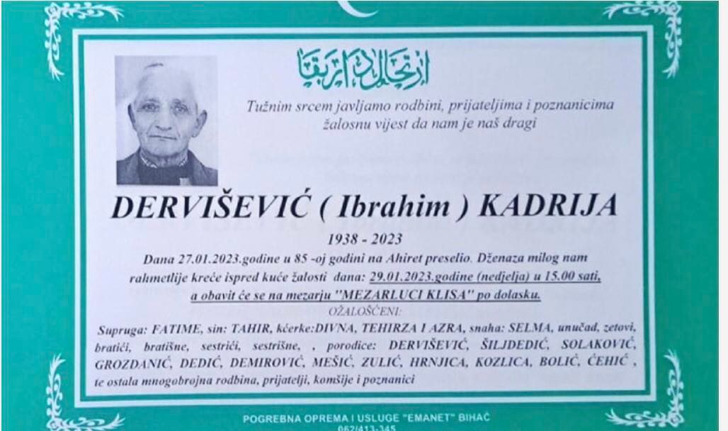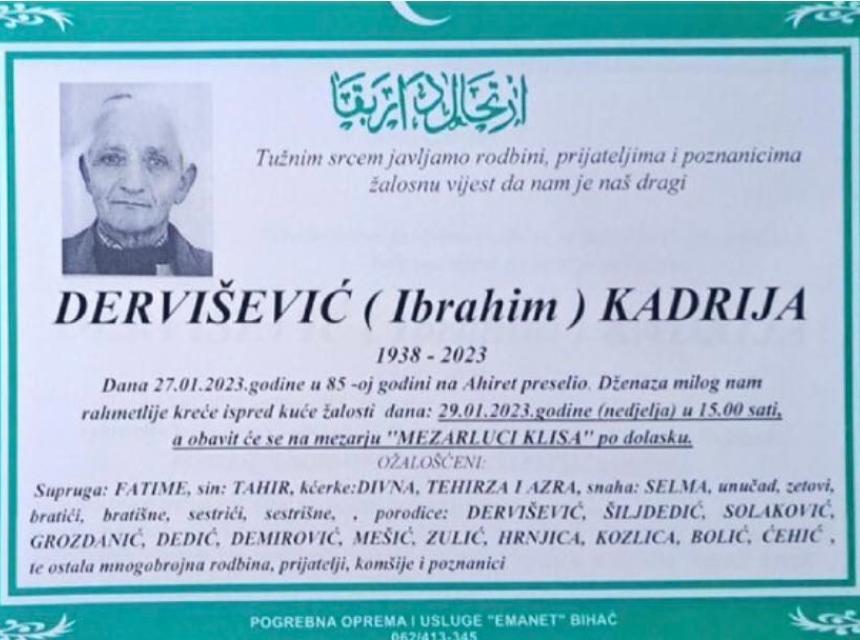 Tužnog srca i s bolom u duši obavještavamo rodbinu, komšije i prijatelje da je naš dragi Dervišević (Ibrahim) Kadrija u 85-oj godini života, preselio na Ahiret.