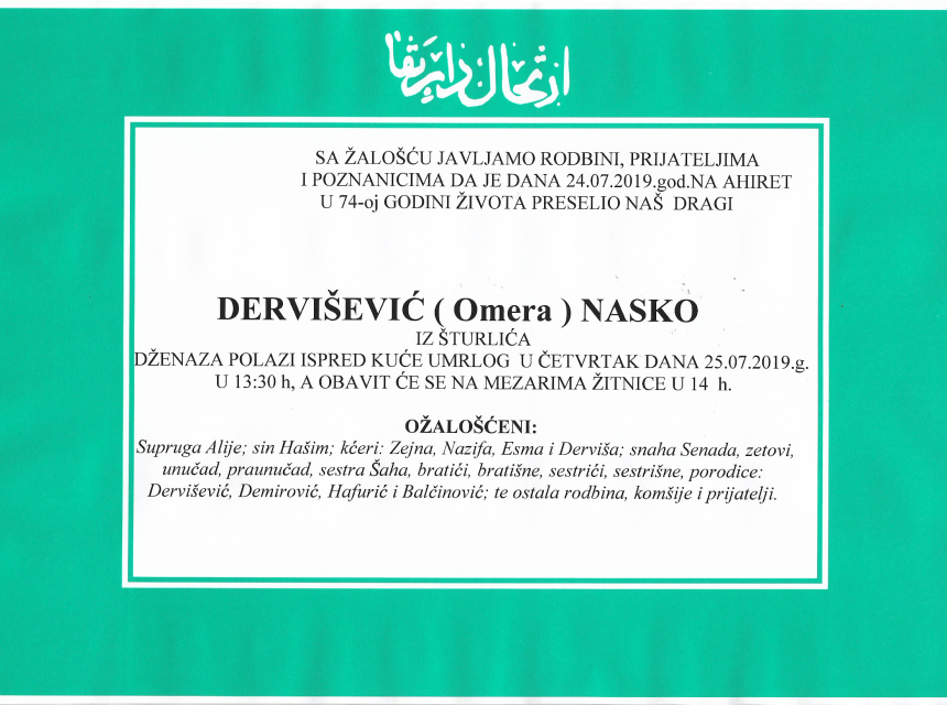 Sa žalošću javljamo rodbini, prijateljima i poznanicima da je dana 24.07.2019. god. na Ahiret u 74-oj godini života preselio naš dragi Dervišević (Omera) Nasko iz Šturlića.