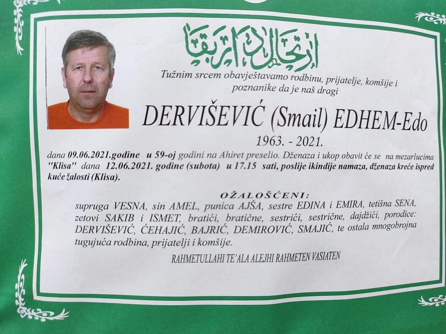 Tužnog srca i s bolom u duši obavještavamo rodbinu, komšije i prijatelje da je naš dragi Dervišević (Smail) Edhem- Edo, 09.06.2021. god u 59. godini života preselio na ahiret.