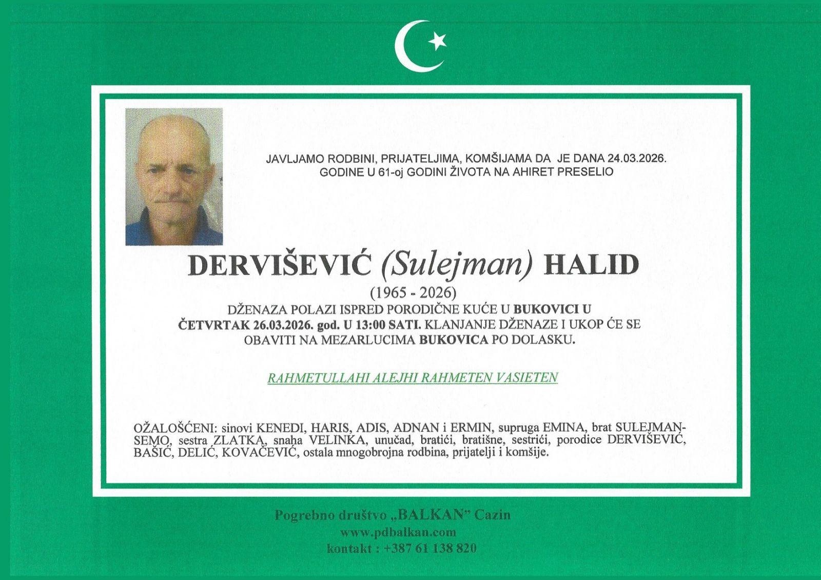 DŽENAZA POLAZI ISPRED PORODIČNE KUĆE U BUKOVICI U ČETVRTAK 26.03.2026. god. U 13:00 SATI. KLANJANJE DŽENAZE I UKOP ĆE SE OBAVITI NA MEZARLUCIMA BUKOVICA PO DOLASKU.