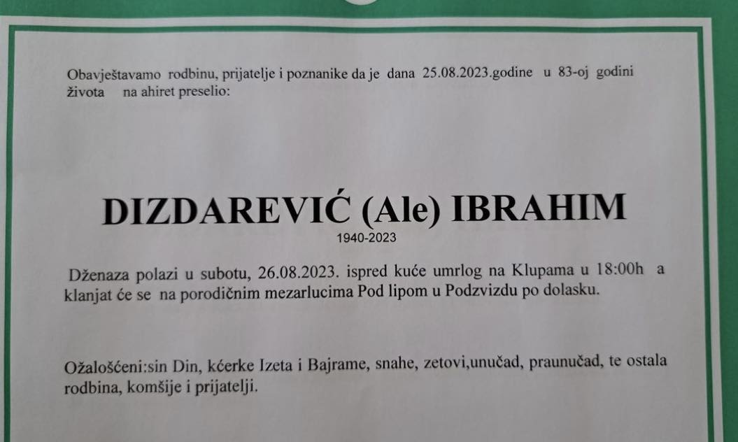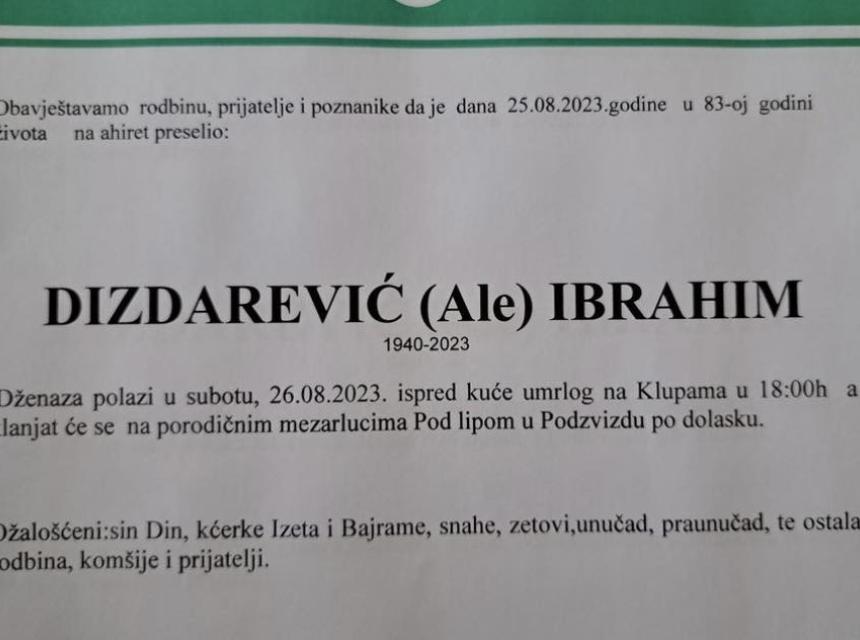 Obavještavamo rodbinu, prijatelje i poznanike da je dana 25.08.2023.godine u 83-oj godini na ahiret preselio života DIZDAREVIĆ (Ale) IBRAHIM.