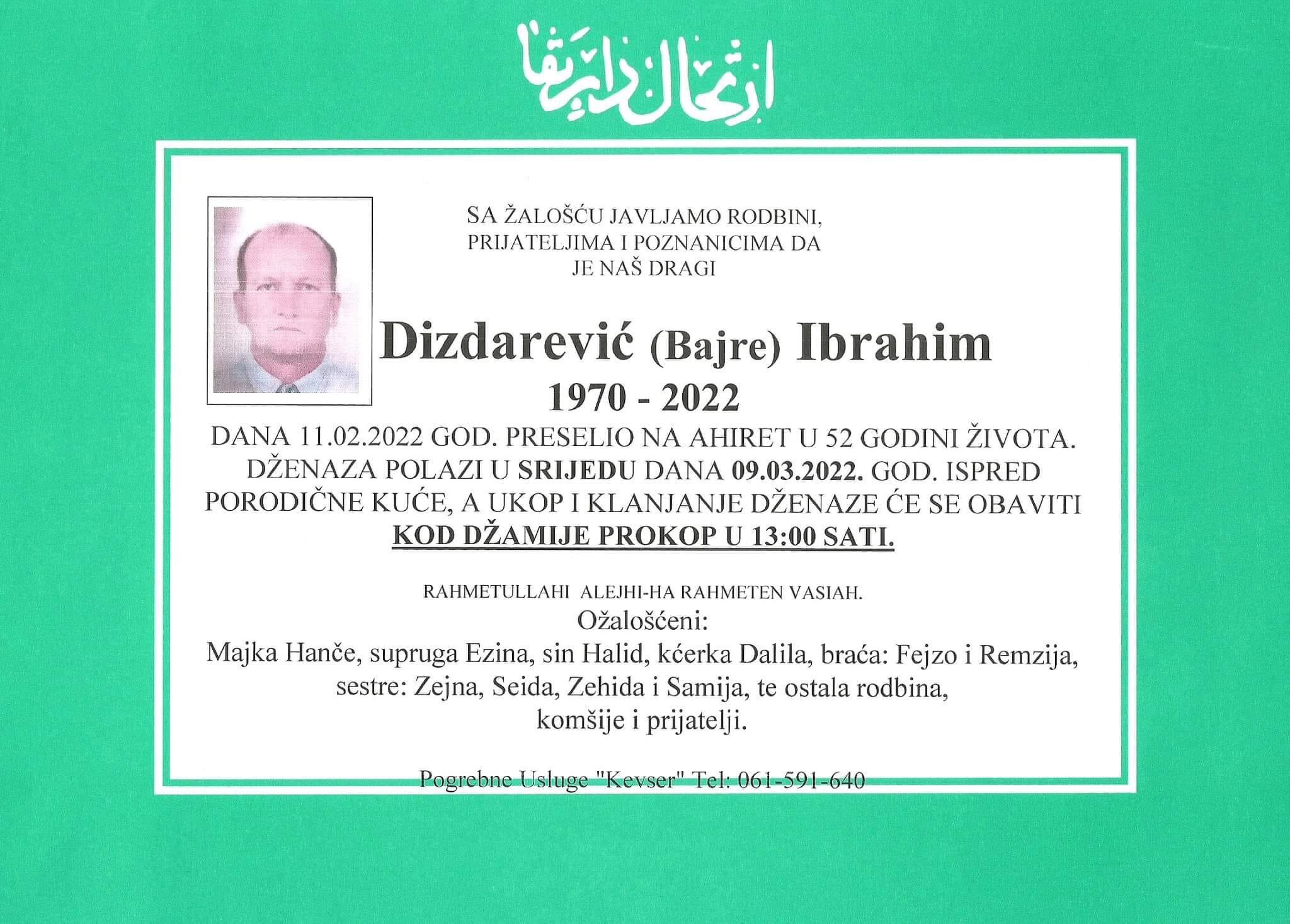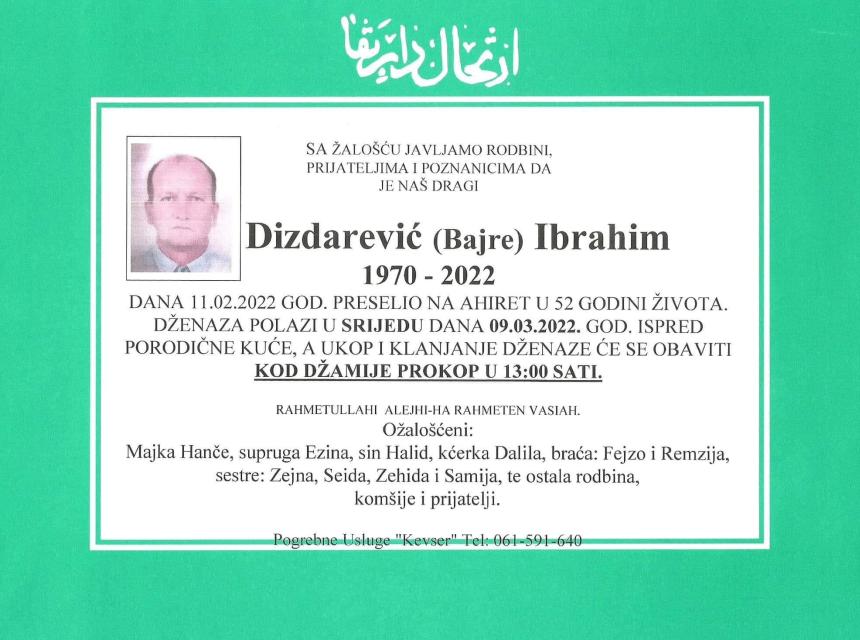 Tužnog srca i s bolom u duši obavještavamo rodbinu, komšije i prijatelje da je naš dragi Na Ahiret preselio Dizdarević (Bajre) Ibrahim dana 11.02.2022.godine u 52-oj godini života, preselio na Ahiret.