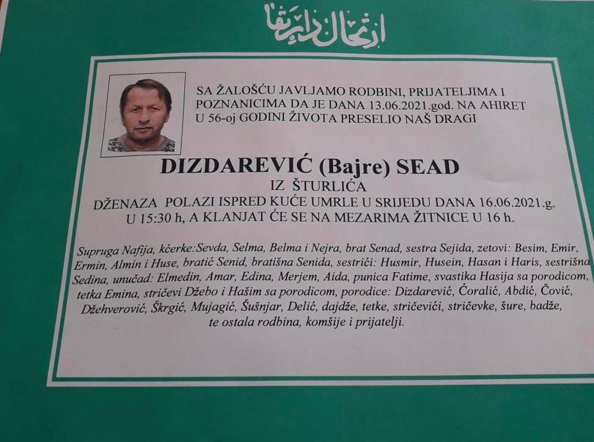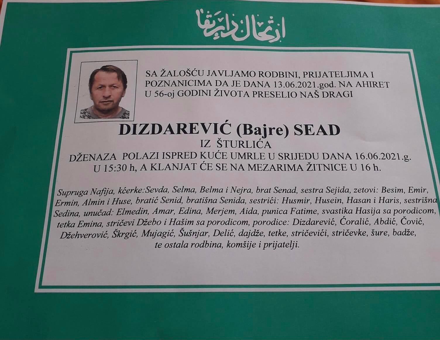 Tužnog srca i s bolom u duši obavještavamo rodbinu, komšije i prijatelje da je naš dragi Dizdarević (Bajre) Sead, dana 13.06.2021. godine, u 56-oj godini života, preselio na Ahiret.
