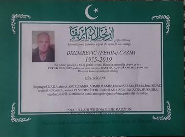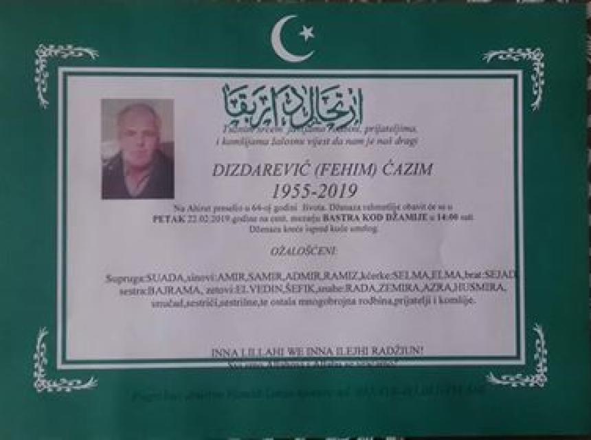 Tužnim srcem u duši javljamo rodbini, prijateljima, komšijama i poznanicima da je u 66-oj. godini života na Ahiret preselio naš dragi Dizdarević (Fehim) Ćazim.