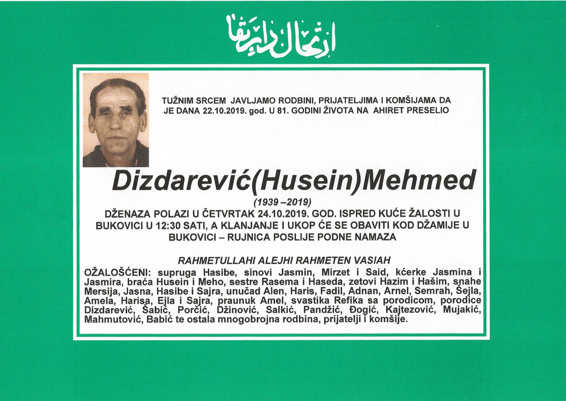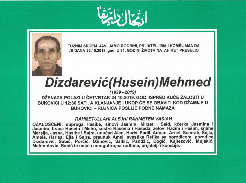 Tužnim srcem javljamo rodbini, prijateljima i komšijama da je dana 22.10.2019. godine u 81-oj godini života na Ahiret preselio Dizdarević (Husein) Mehmed.