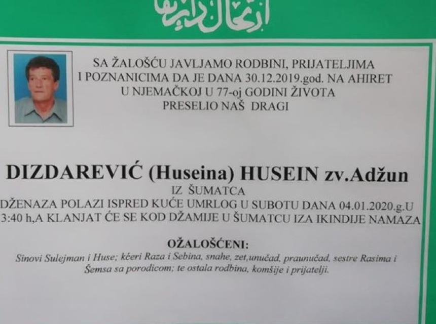 Duboko ožalošćeni obavještavamo rodbinu, prijatelje i komšije da je naš dragi Dizdarević (Huseina) Husein zvani Adžun preselio na Ahiret u Njemačkoj dana 30.12.2019. godine u 77. godini života.