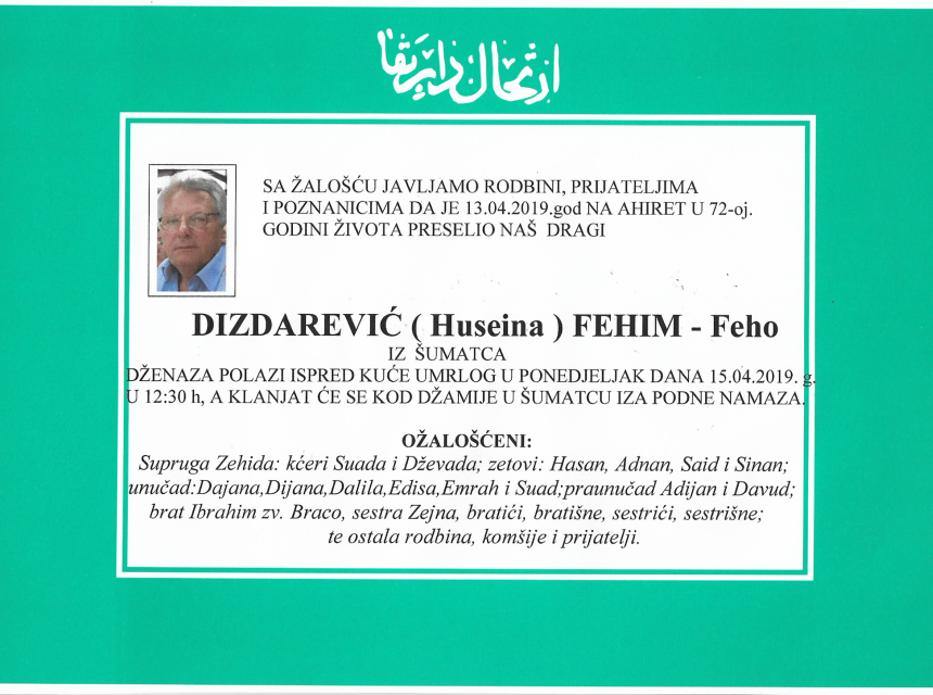 Tužnim srcem javljamo rodbini, prijateljima i komšijama da je dana 13.04.2019. godine u 72-oj godini života na Ahiret preselio naš dragi Dizdarević (Huseina) Fehim - Feho.