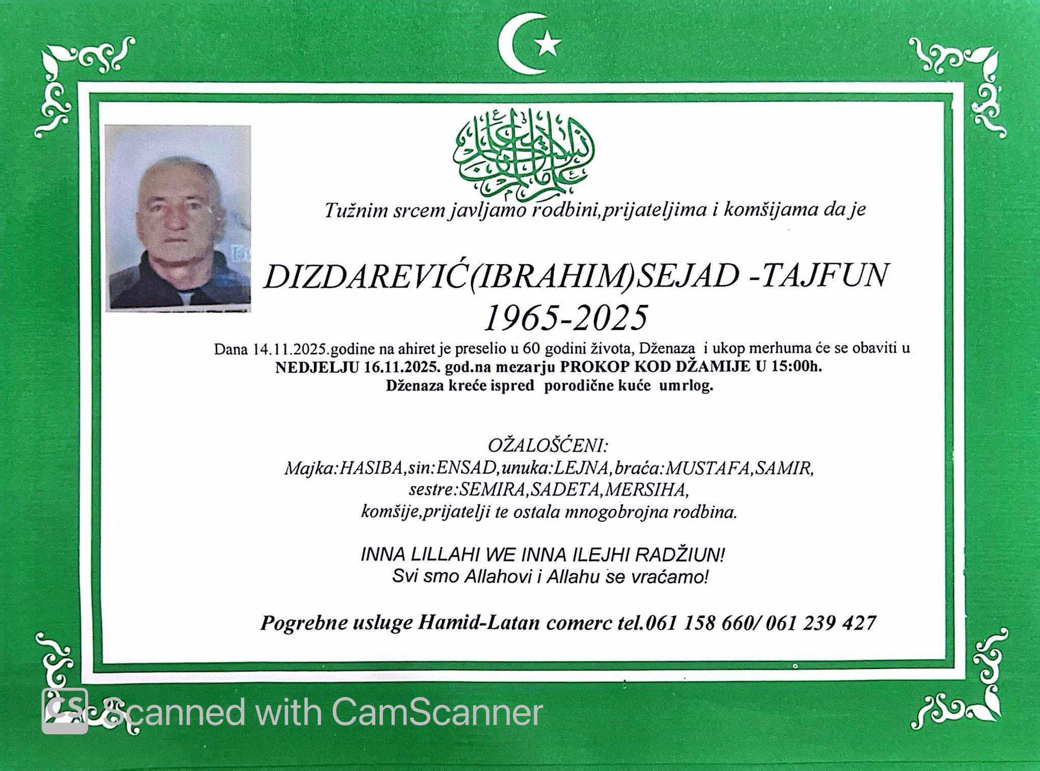 Tužnim srcem i bolom u duši javljamo rodbini, prijateljima i komšijama da je naš dragi Dizdarević (Ibrahim) Sejad - Tajfun, dana 14.11.2025. godine u 60-oj godini života, preselio na Ahiret.