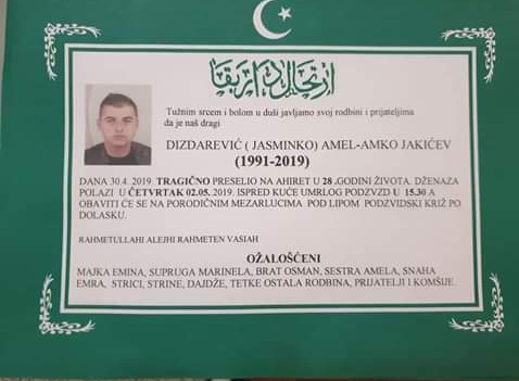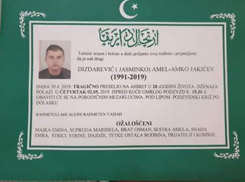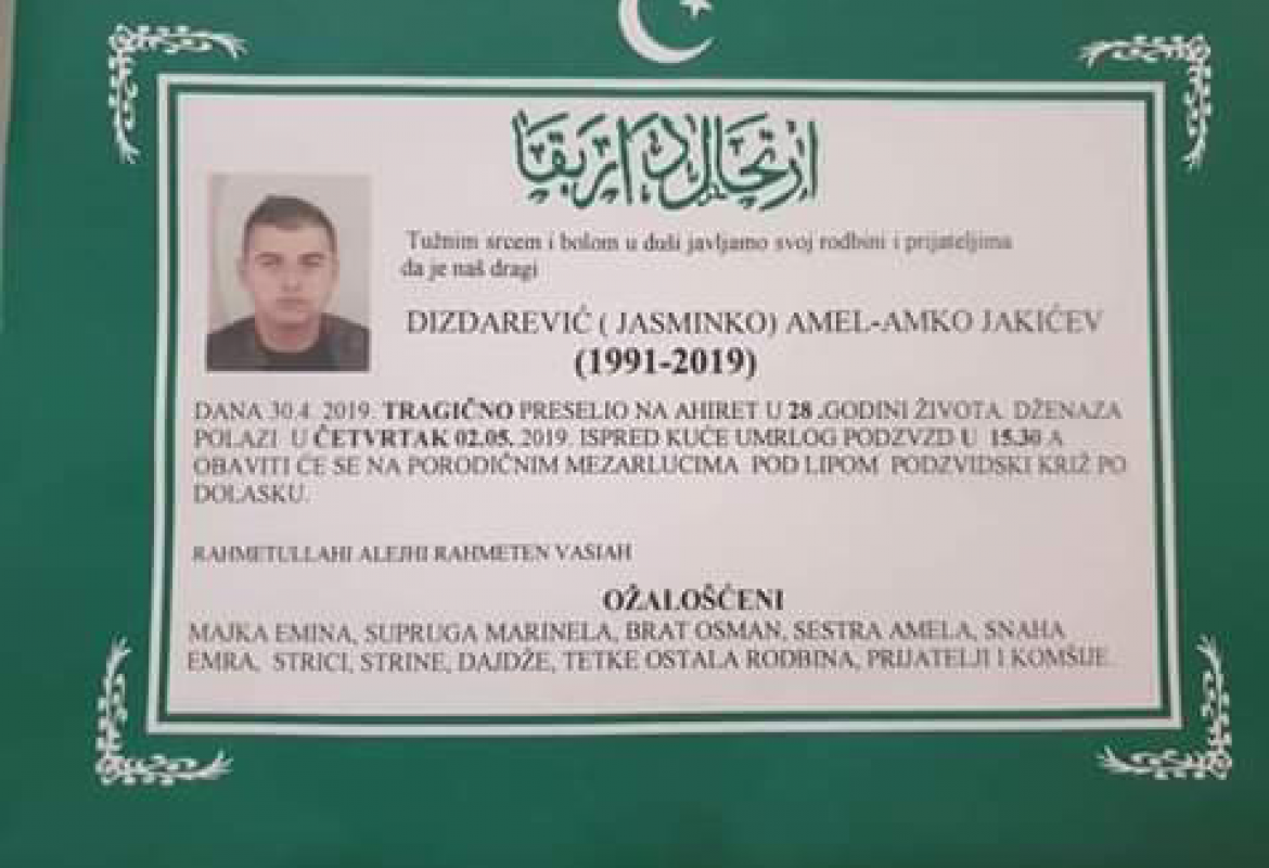 Tužnim srcem i bolom u duši javljamo rodbini, prijateljima, komšijama i poznanicima da je dana 30.04.2019. godine u 28.-oj godini života tragično na Ahiret preselio naš dragi Dizdarević (Jasminko) Amel - Amko Jakićev.