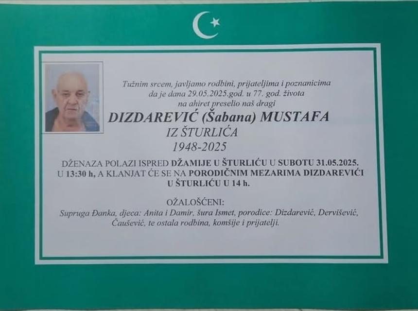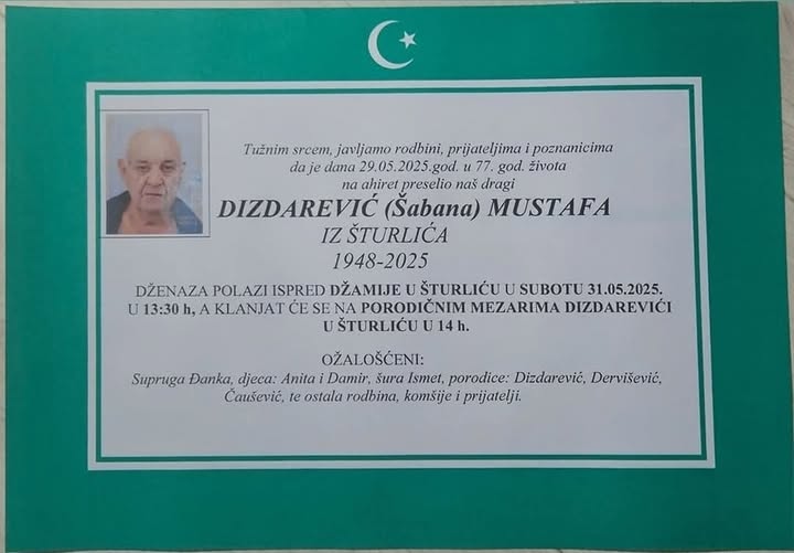 Dženaza polazi ispred kdžamije u Šturliću u subotu 31.05.2025. godine u 13:30h, a klanjat će se kod na porodičnom mezarju Dizdarevići u 14 sati..