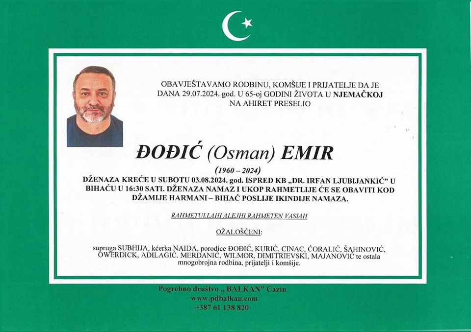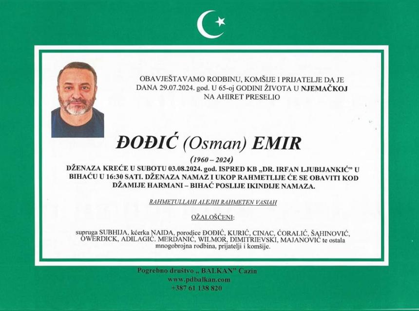 Tužnim srcem javljamo rodbini, prijateljima i komšijama da je dana 29.07.2024. god. u 65. godini života na ahiret preselio Đođić (Osman) Emir.