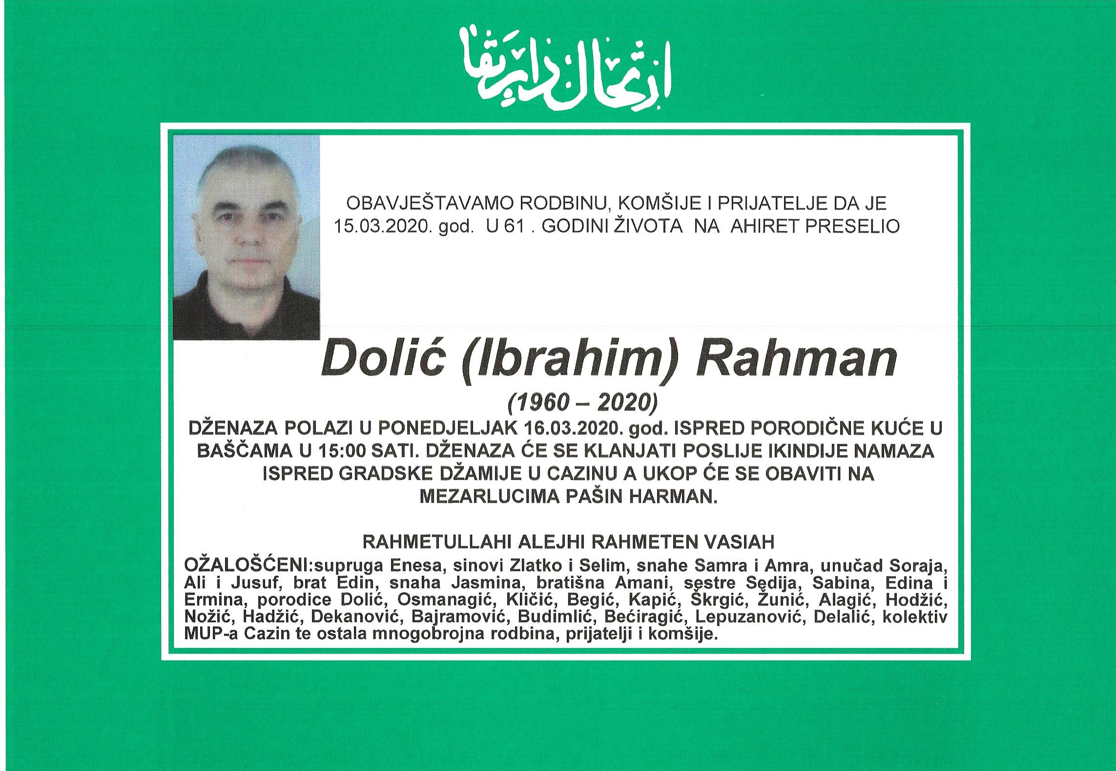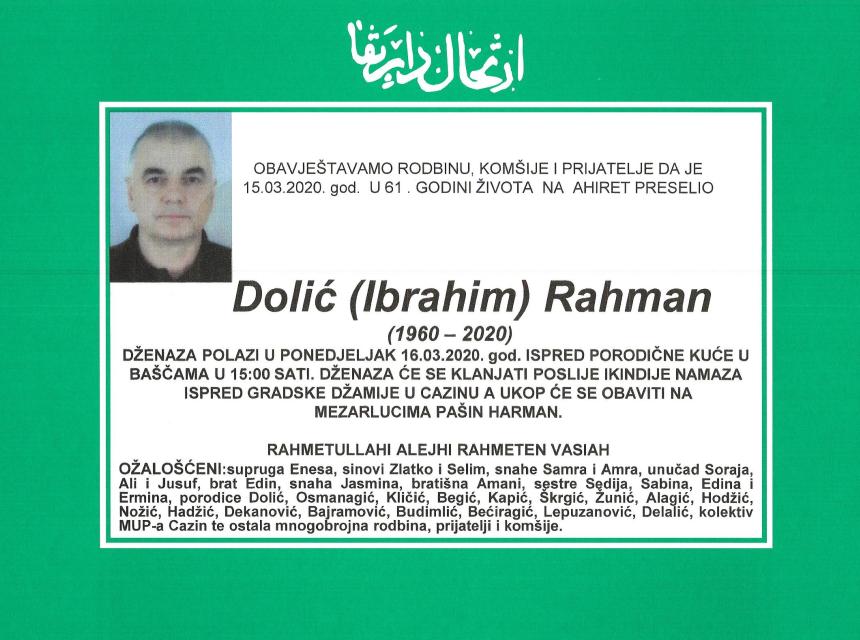 Teškim srcem i bolom u duši javljamo da je naš dragi i nikad prežaljeni Cazinjanin Dolić (Ibrahim) Rahman dana 15.03.2020.godine u 61-oj godini života preselio na Ahiret.