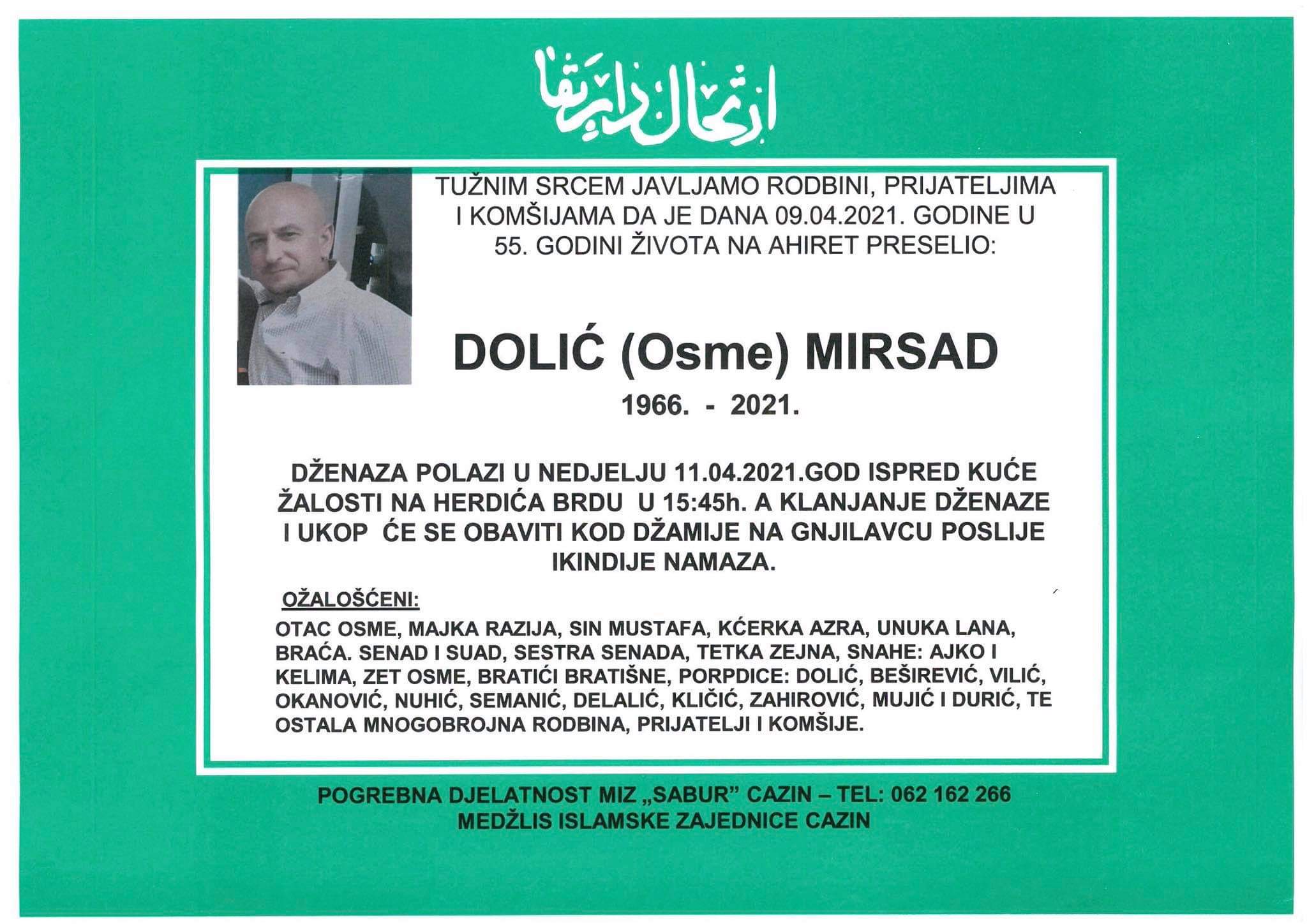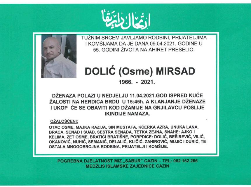 Tužnog srca i s bolom u duši obavještavamo rodbinu, komšije i prijatelje da je naš dragi Dolić (Osme) Mirsad 09.04.2021. godine, u 55. godini života preselio na ahiret.