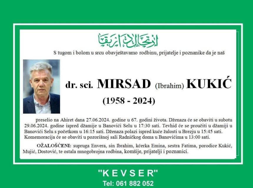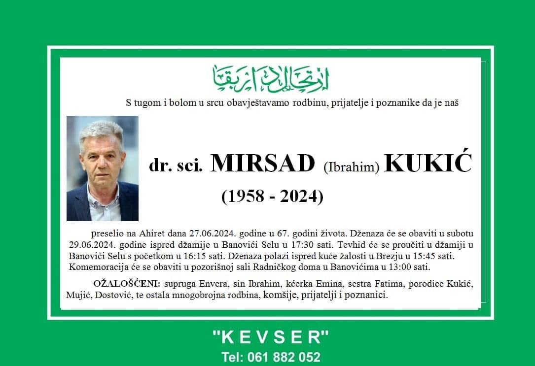 Tužnim srcem i bolom u duši javljamo rodbini, prijateljima i komšijama da je naš dragi dr. sci. Mirsad (Ibrahim) Kukić, dana 27.06.2024. godine u 67-oj godini života, preselio na Ahiret.