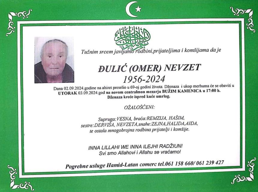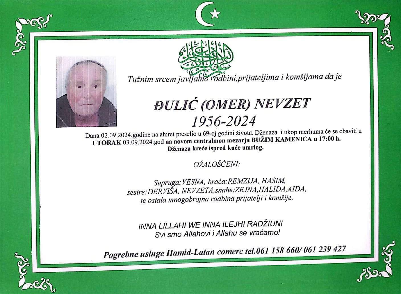 Tužnim srcem i bolom u duši javljamo rodbini, prijateljima i komšijama da je naš dragi Đulić (Omer) Nevzet, dana 02.09.2024. godine u 69-oj godini života, preselio na Ahiret.