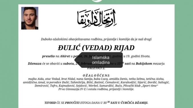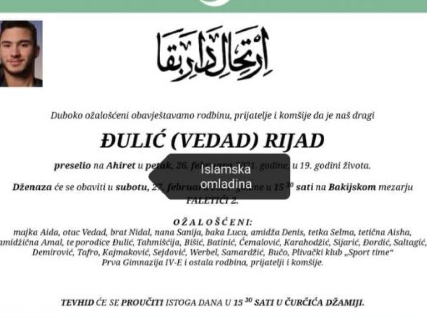 Tužnog srca i s bolom u duši obavještavamo rodbinu, komšije i prijatelje da je naš dragi Đulić (Vedad) Rijad 26. februara 2021. godine u 19-oj godini života preselio na Ahiret.