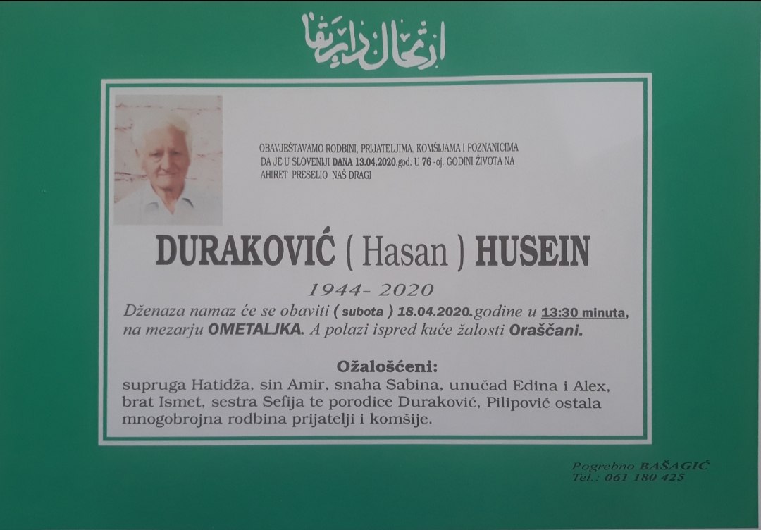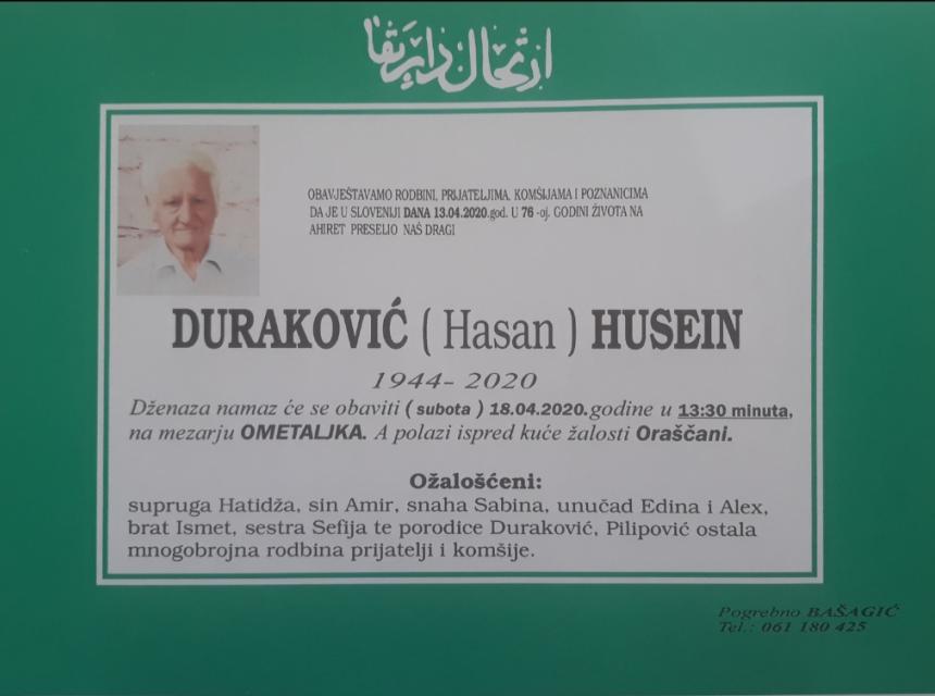 Teškim srcem i bolom u duši javljamo da je naš dragi i nikad prežaljeni Duraković (Hasan) Husein dana 13.04.2020.godine u 76-toj godini života preselio na Ahiret.