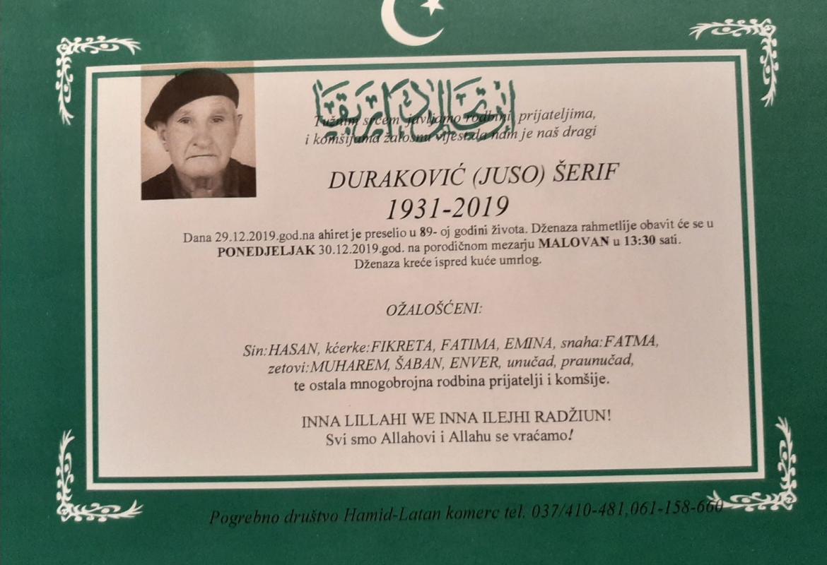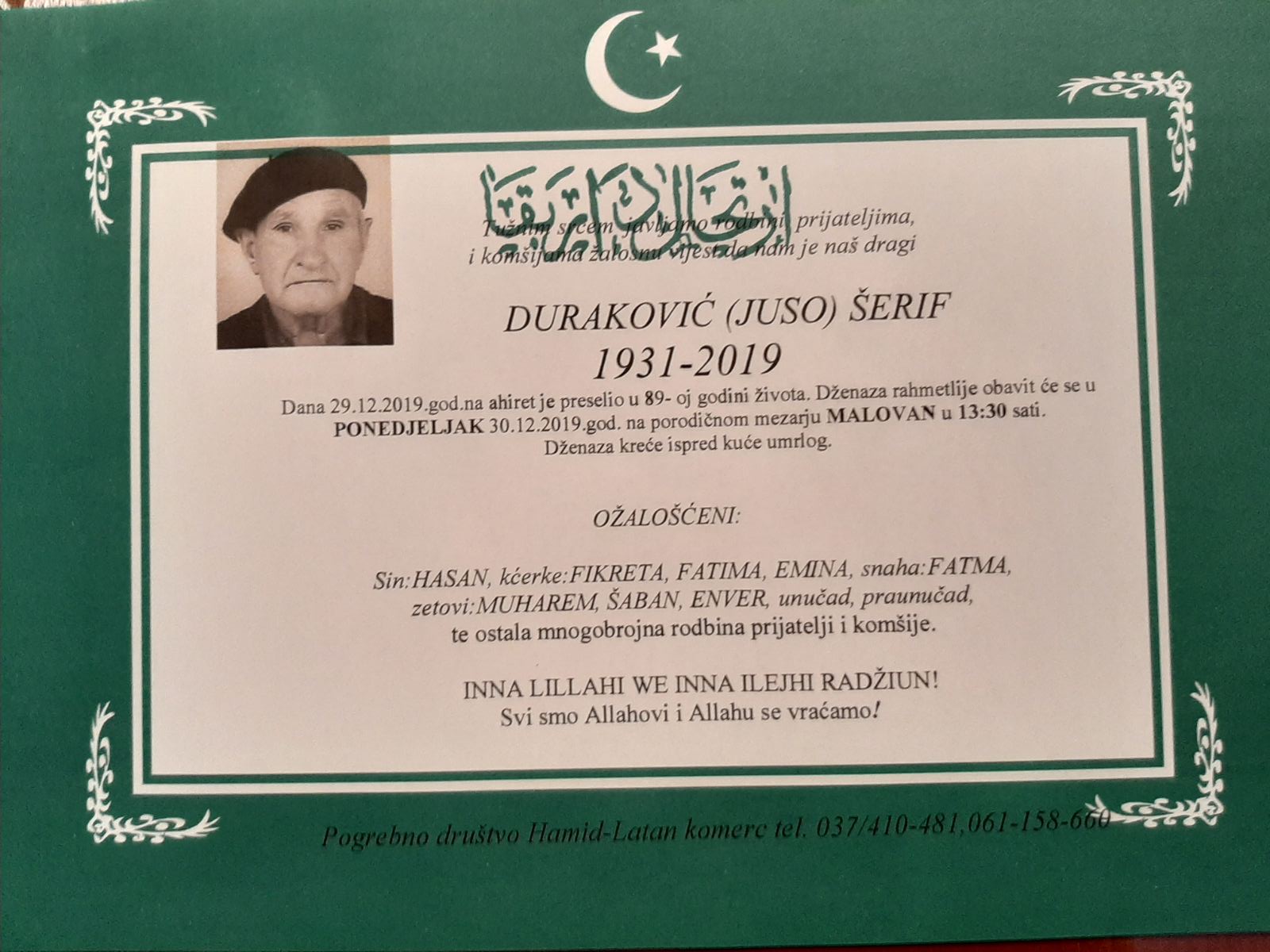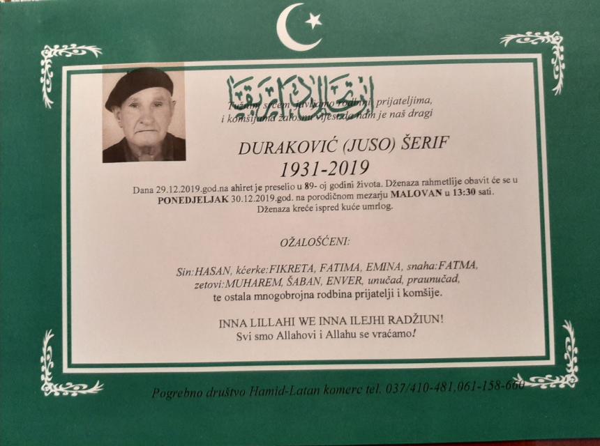 Tužni srcem obaviještavamo rodbinu, prijatelje i poznanike da je naš dragi Duraković (Juso) Šerif dana 29.12.2019. godine u 89-oj godini života na Ahiret preselio. Dženaza rahmetlije obavit će se u ponedjeljak 30.12.2019. godine na porodičnom mezarju Malovan u 13:30 minuta. Dženaza kreće ispred kuće umrlog.