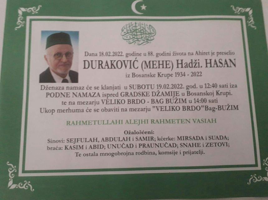 Tužnog srca i s bolom u duši obavještavamo rodbinu, komšije i prijatelje da je naš dragi Duraković (Mehe) Hadži. Hasan 18.02.2022. u 88. godini života preselio na ahiret.