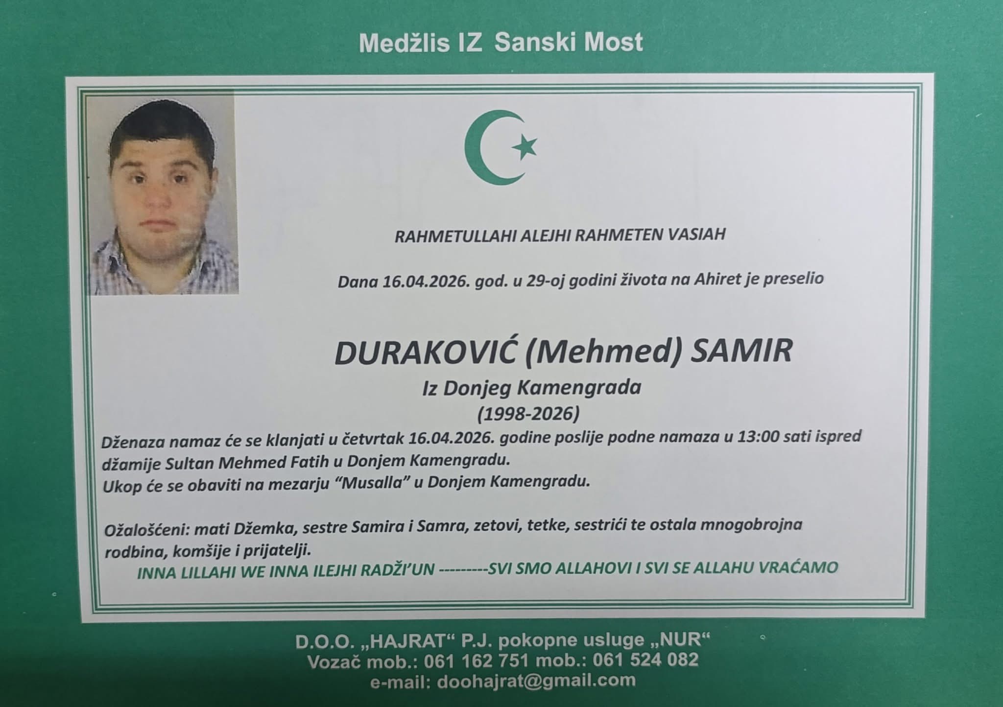 Dženaza-namaz će se klanjati u četvrtak 16.04.2026. godine poslije podne-namaza u 13:00 sati ispred džamije Sultan Mehmed Fatih u Donjem Kamengradu.