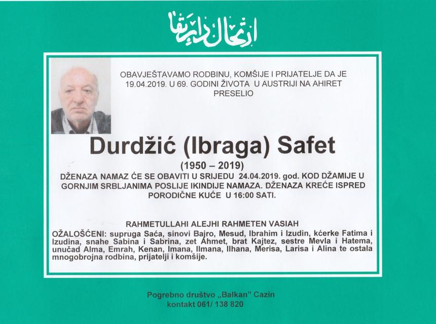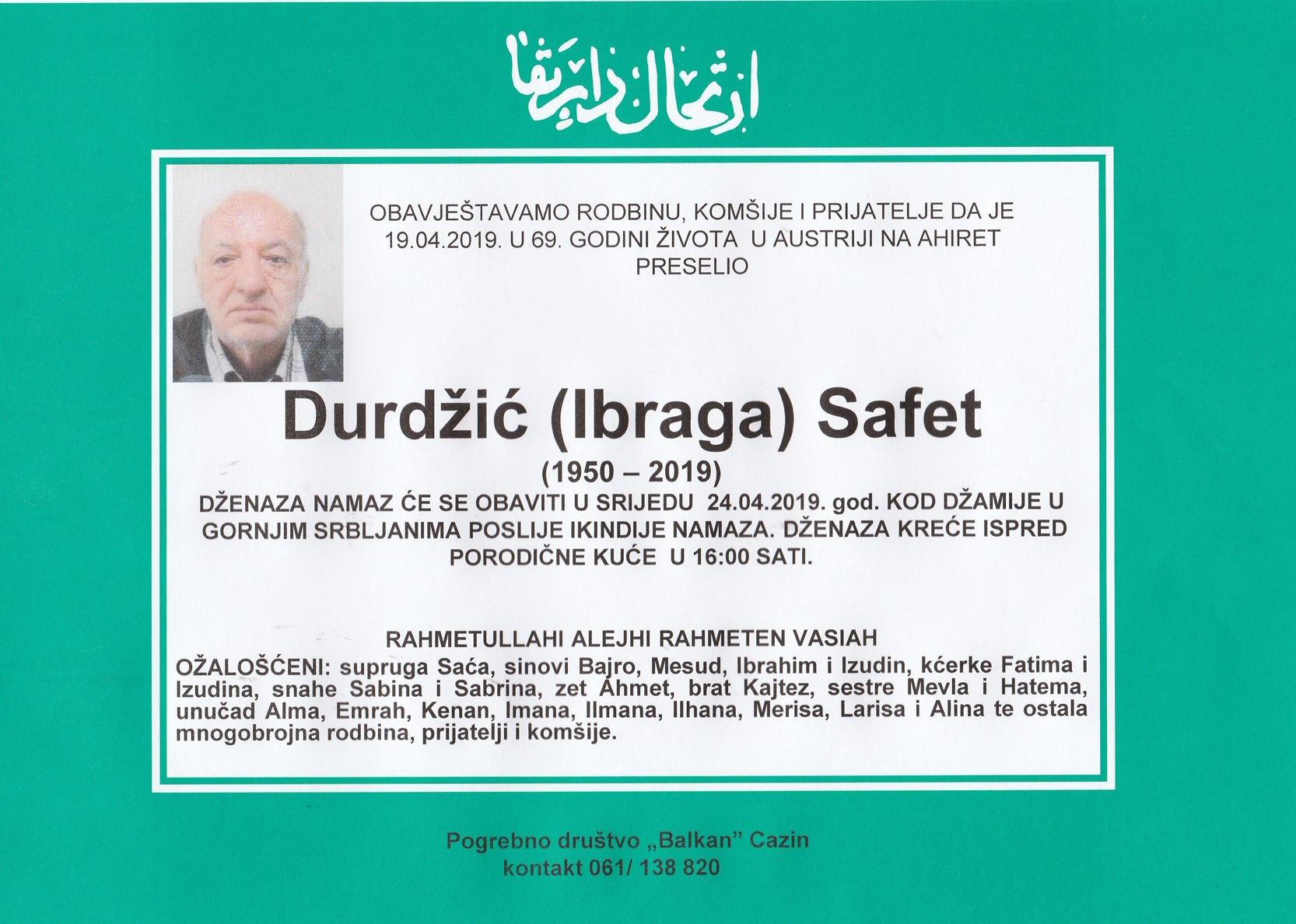 Tužnim srcem i bolom u duši javljamo rodbini, prijateljima i komšijama žalosnu vijest da je 19.04.2019. u 69. godini na Ahiret preselio naš dragi Durdžić (Ibraga) Safet.