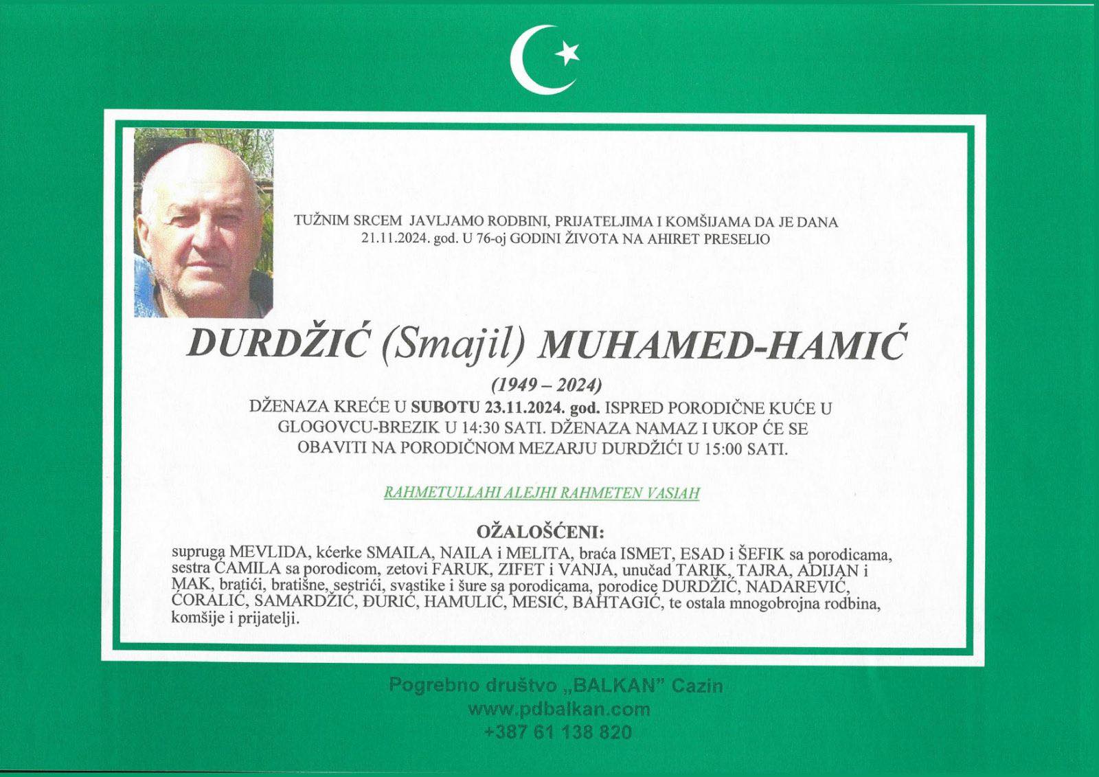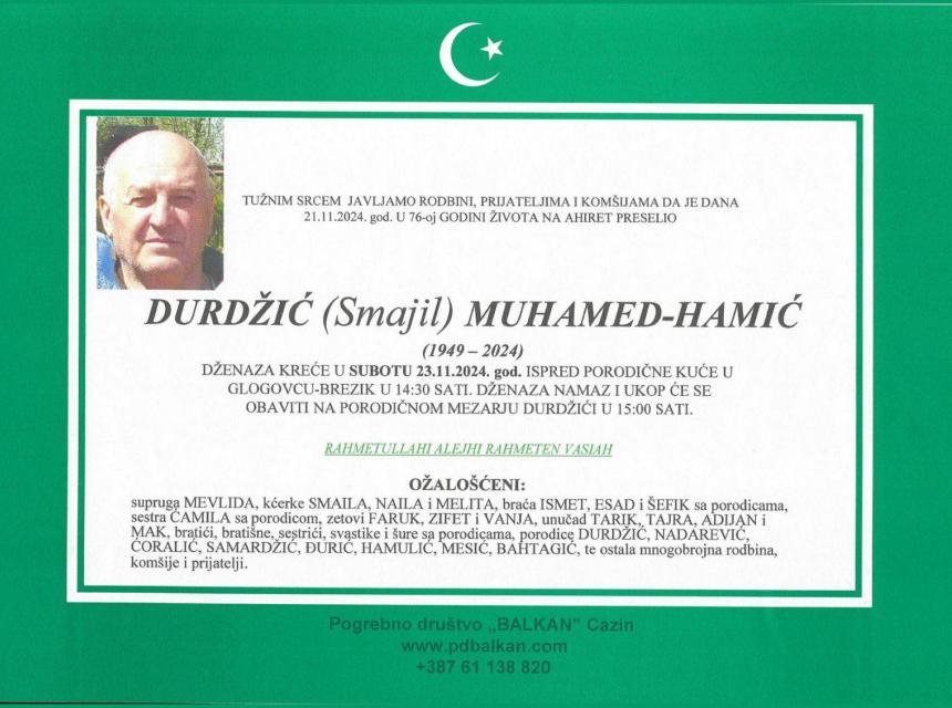 Tužnim srcem obavještavamo rodbinu, prijatelje i komšije da je dana 21.11.2024. god. u 76.-oj godini života na ahiret preselio Durdžić (Smajil) Muhamed-Hamić.