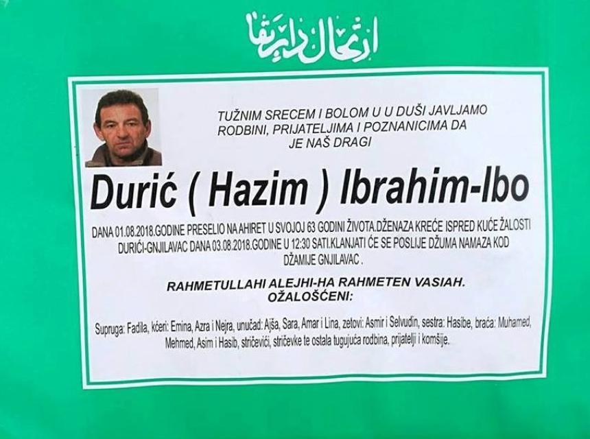 Tužnim srcem i bolom u duši javljamo rodbini,prijateljima, komšijama i poznanicima da je dana 01.08.2018. godine u 63-oj godini života na Ahiret preselio Durić (Hazim) Ibrahim-Ibo.