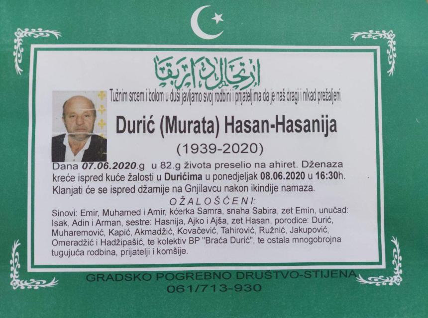Teškim srcem i bolom u duši javljamo da je naš dragi i nikad prežaljeni Durić (Murata) Hasan-Hasanija dana 07.06.2020.godine u 82-oj godini života preselio na Ahiret.