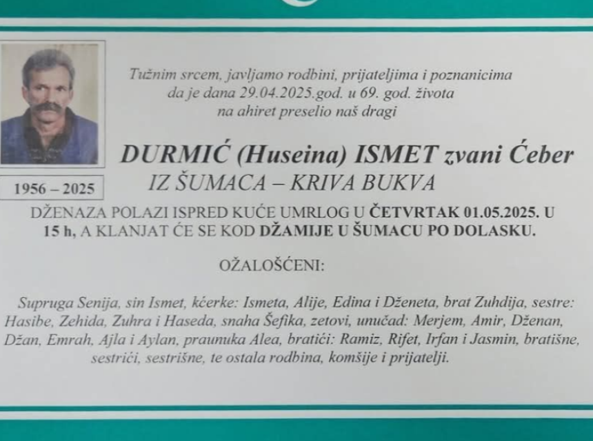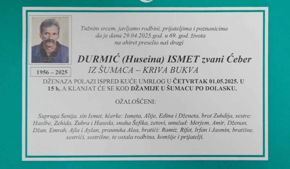 Obavještavamo rodbinu i prijatelje da je 29. aprila na ahiret u 69. godini života preselio Durmić (Huseina) Ismet zvani Ćeber iz Šumatca, Kriva Bukva.