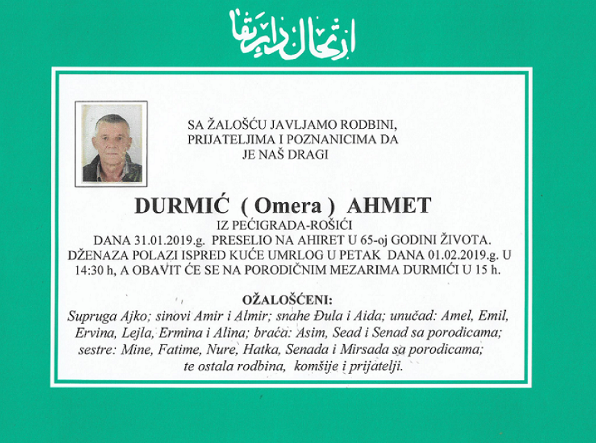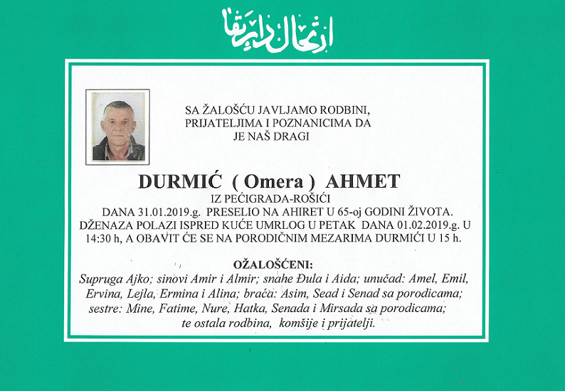 Sa žalošću javljamo rodbini, prijateljima i poznanicima da je 31.01.2019. godine u 65. godini života na Ahiret preselio naš dragi Durmić (Omera) Ahmet iz Pećigrada - Rošići.