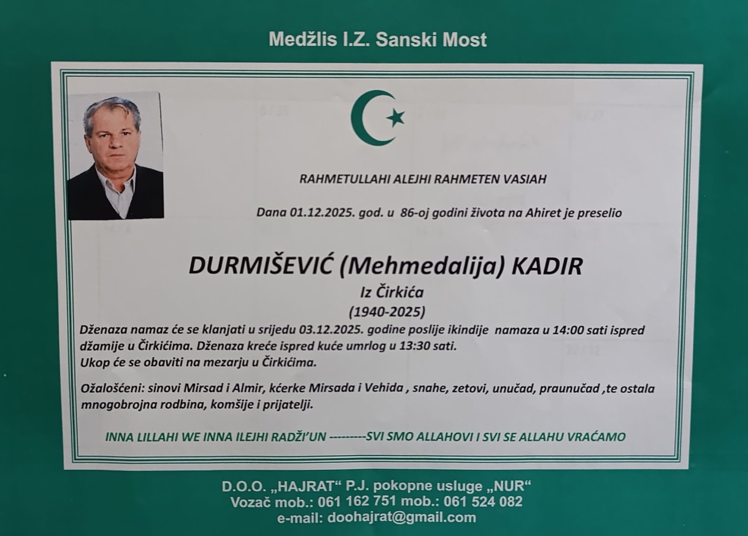 Dženaza namaz će se klanjati u srijedu, 03.12.2025. godine, poslije ikindije namaza u 14:00 sati ispred džamije u Ćirkićima.